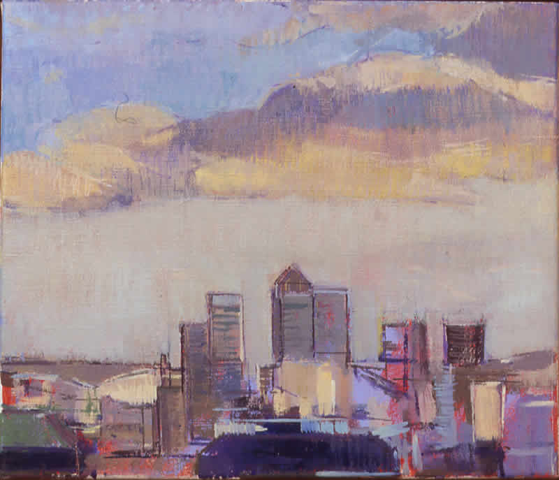 Canary Wharf from the Barbican, 2005, Oil on Canvas, 30cm x 35cm