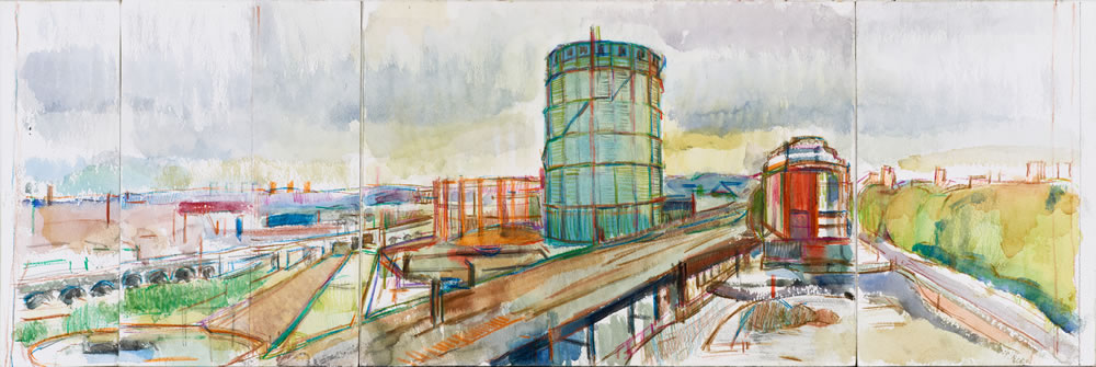 Battersea Gasholder (last drawing before dismantling) 2015 Ink, colour pencil and watercolour on paper 20cm x 60cm
